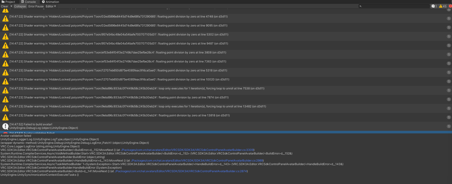 VRC.SDK3A.Editor.VRCSdkControlPanelAvatarBuilder/d__141:MoveNext () (at ./Packages/com.vrchat.avatars/Editor/VRCSDK/SDK3A/VRCSdkControlPanelAvatarBuilder.cs:2874)