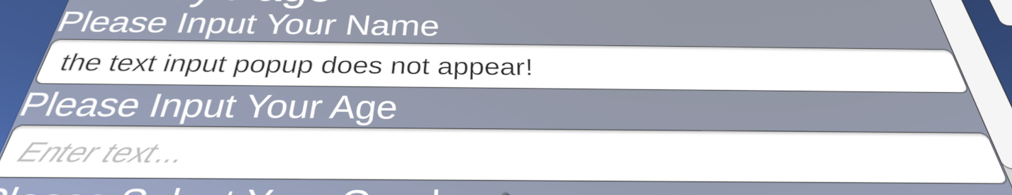 However, when interacting with an InputField that is dynamically generated at runtime, the text input popup does not appear as shown in the image below, which is inconvenient as pressing keys like WASD or R causes movement or opens menus.